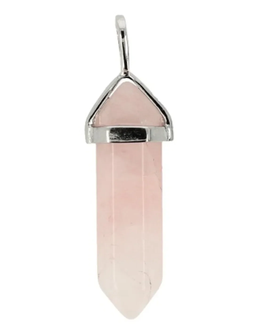 Een prachtige halfedelsteen hanger van rozenkwarts, met een zilverkleurige dubbeleinder, afkomstig uit Madagaskar. Lengte 4,3 cm