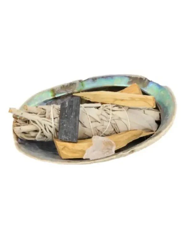 Inhoud abaloneschelp, saliesmudgestick, 2 palo santo stokjes , toermalijnkristal en lemurisch kristal
